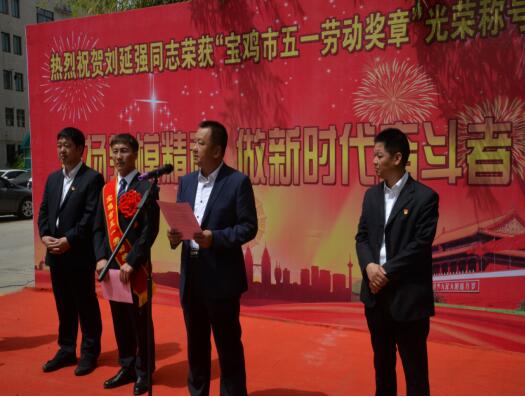 4月30日,寶雞市勞動(dòng)者之歌暨慶?!拔逡弧眹H勞動(dòng)節(jié)大會勝利召開,公司劉延強(qiáng)同志被授予“寶雞市五一勞動(dòng)獎(jiǎng)?wù)隆惫鈽s稱號,公司在總部辦公樓前舉行了簡樸隆重的歡迎儀式。公司副董事長、總經(jīng)理胥立,黨委書記景旭東,工會主席王建成等出席儀式,總部全體、寶雞文化藝術(shù)中心項(xiàng)目部管理人員參加。