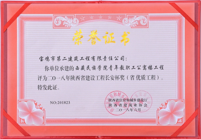 長安杯獎是陜西省住房和城鄉(xiāng)建設(shè)廳評選、頒發(fā)的本省建設(shè)工程質(zhì)量最高榮譽獎。西藏民族學(xué)院青年職工公寓樓工程是西藏民族學(xué)院(現(xiàn)更名西藏民族大學(xué))確定的重點建設(shè)工程項目,也是公司推行內(nèi)部模擬股份制架構(gòu)下精細化管理模式試點項目。在建設(shè)初期,公司總部精心策劃,全力部署,公司領(lǐng)導(dǎo)多次蒞臨施工現(xiàn)場檢查指導(dǎo)工作。公司副總經(jīng)理兼項目經(jīng)理曾永祥精心組織,細化分工,責(zé)任到人,嚴(yán)格要求項目部全體管理人員,并堅持以身作則,帶領(lǐng)整個團隊,戰(zhàn)高溫、抗嚴(yán)寒、抓質(zhì)量、搶進度,最終完成了這項經(jīng)得起各方檢驗的優(yōu)質(zhì)工程,為業(yè)主和社會交上了一份滿意的答卷。