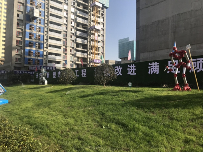 巧布園林式工地。項目在主題施工過程中就對園林景觀部分已穿插施工完成了一半,實現(xiàn)了真正意義的“園林工地”。