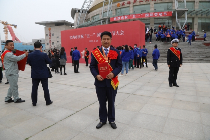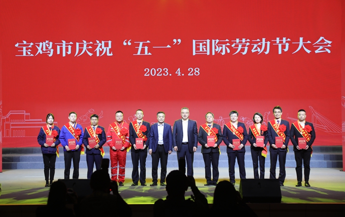 4月28日,在寶雞市慶祝“五一”國際勞動節(jié)大會上,集團公司李紅軍同志被寶雞總工會授予五一勞動獎章,并上臺領獎。(左三)